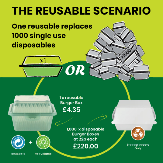 Our reusable food boxes can be used up to 1000 times. They’re dishwasher safe and provide an excellent solution for street food vendors and events. Washing and reusing might seem time consuming, but the figures can make huge changes to you and your business.