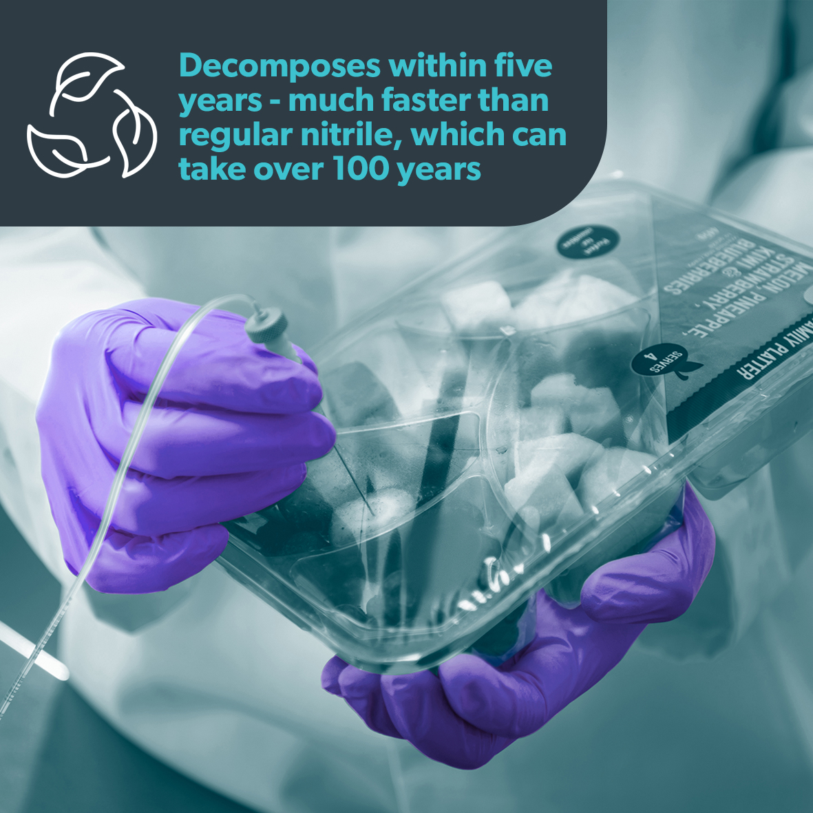 - Decomposes within five years – much faster compared to regular nitrile, which can take over 100 years